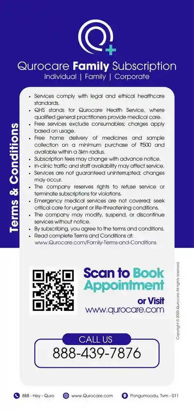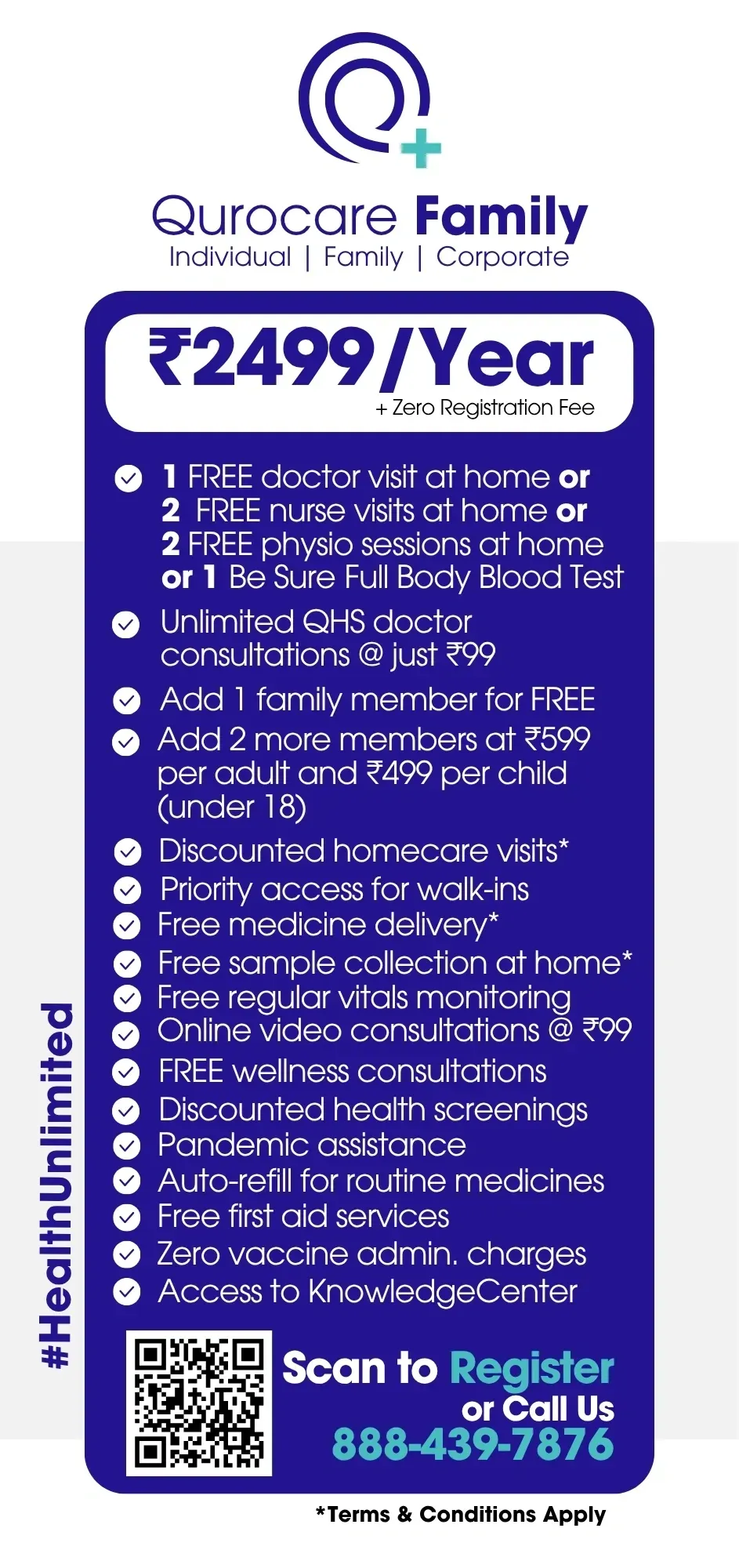 The Qurocare Family Membership is a subscription that offers a comprehensive healthcare solution, making you a part of an exclusive community. Enjoy unlimited healthcare visits, priority walk-ins, free first aid and vaccinations, medicine delivery, and more.